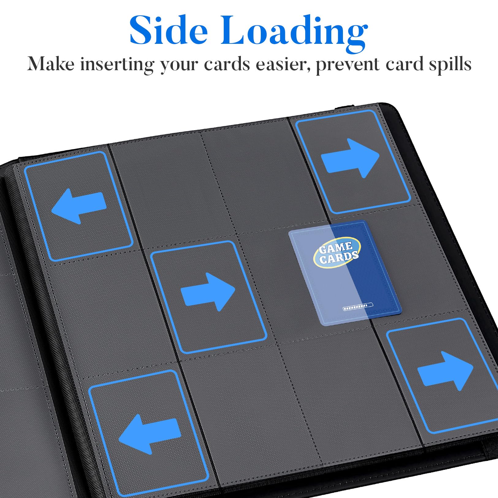 Side Loading Padded Sheets: Side loading pockets make inserting your cards easier, yet help reduce card spills. All pages are padded and built to resist warping, as great backdrops to display cards. The middle section is specially widen to avoid bending the cards on the first column.