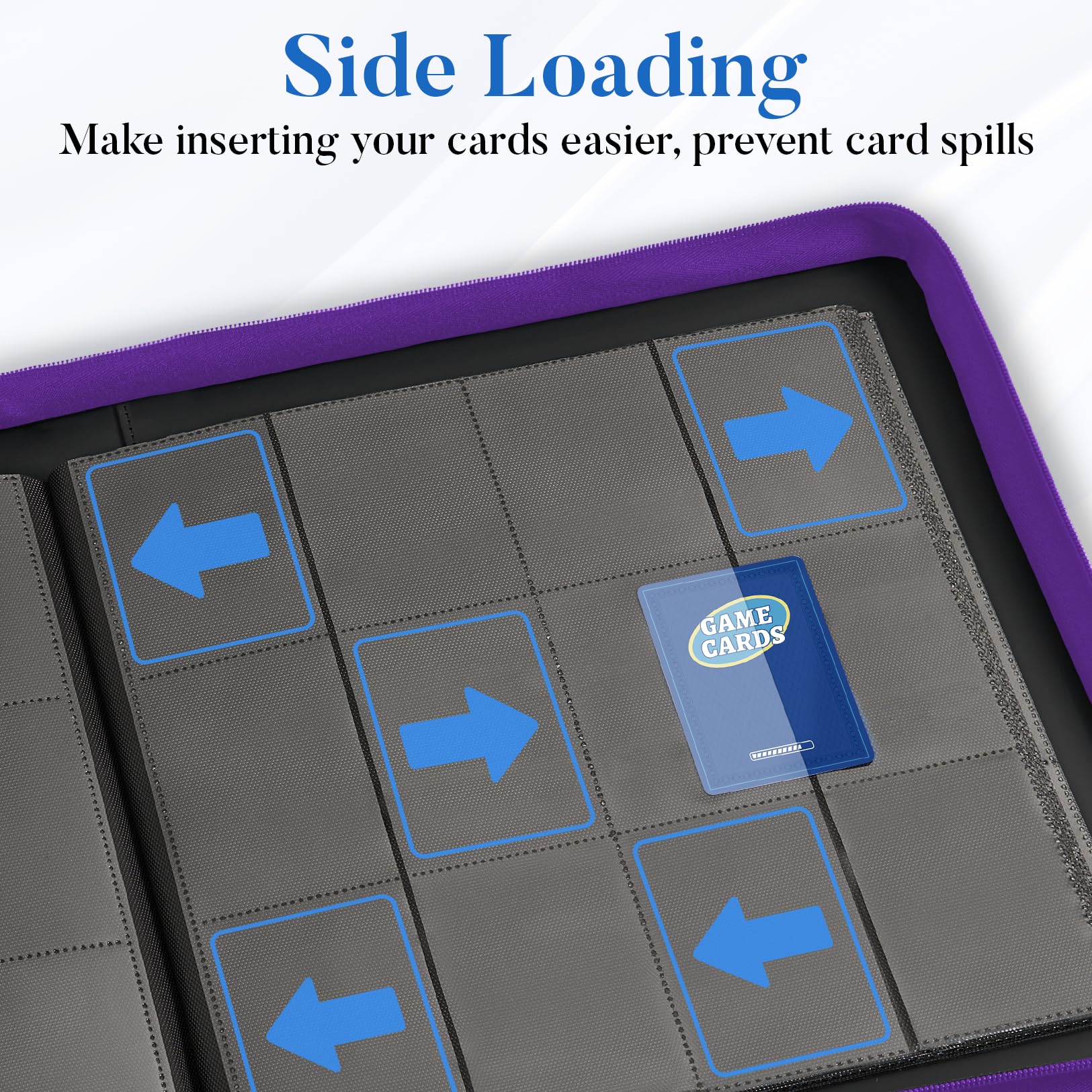 Side Loading Padded Sheets: Side loading pockets make inserting your cards easier, yet help reduce card spills. All pages are padded and built to resist warping, as great backdrops to display cards. The middle section is specially widen to avoid bending the cards on the first column.